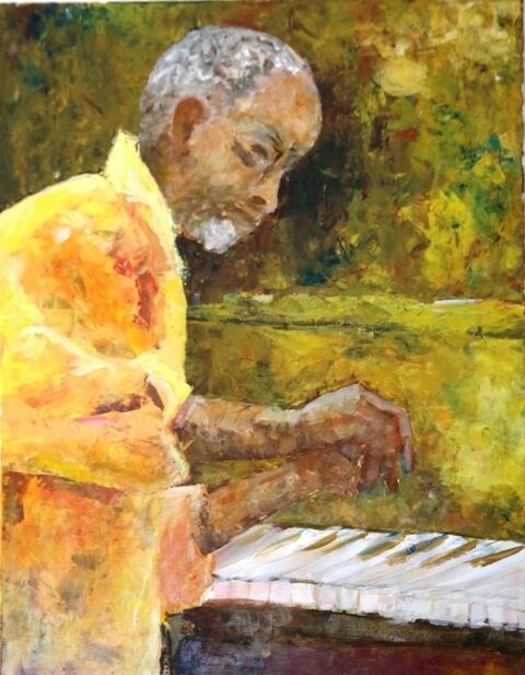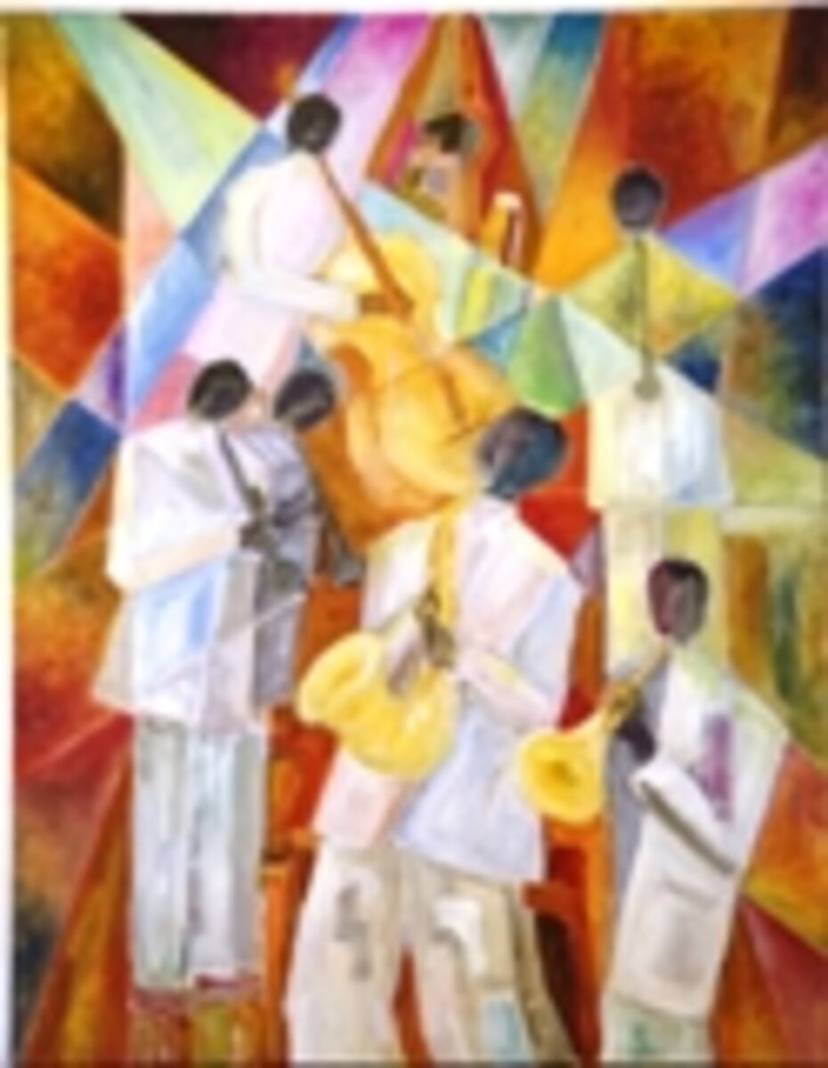 - Acrylique sur toile 103 x 95 - L'ambiance, les sensations et la complicité. Le signal du trompète au sax après son impro.