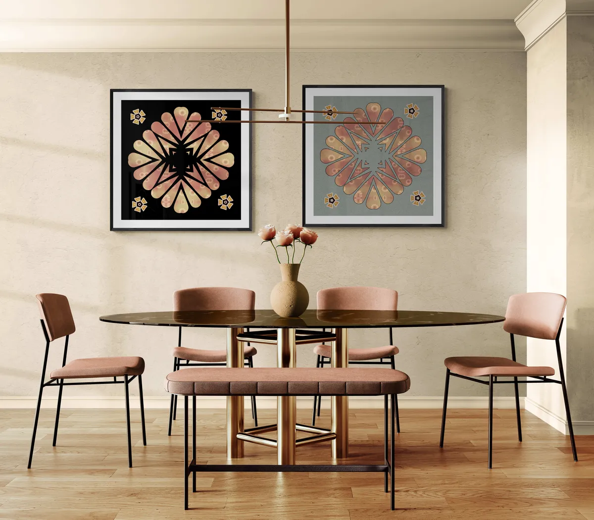 The background of this painting was inspired by the pink sunsets of the Himalayans. The flowers are blue poppies that grow there. I wanted to paint an atmosphere of peace and calm