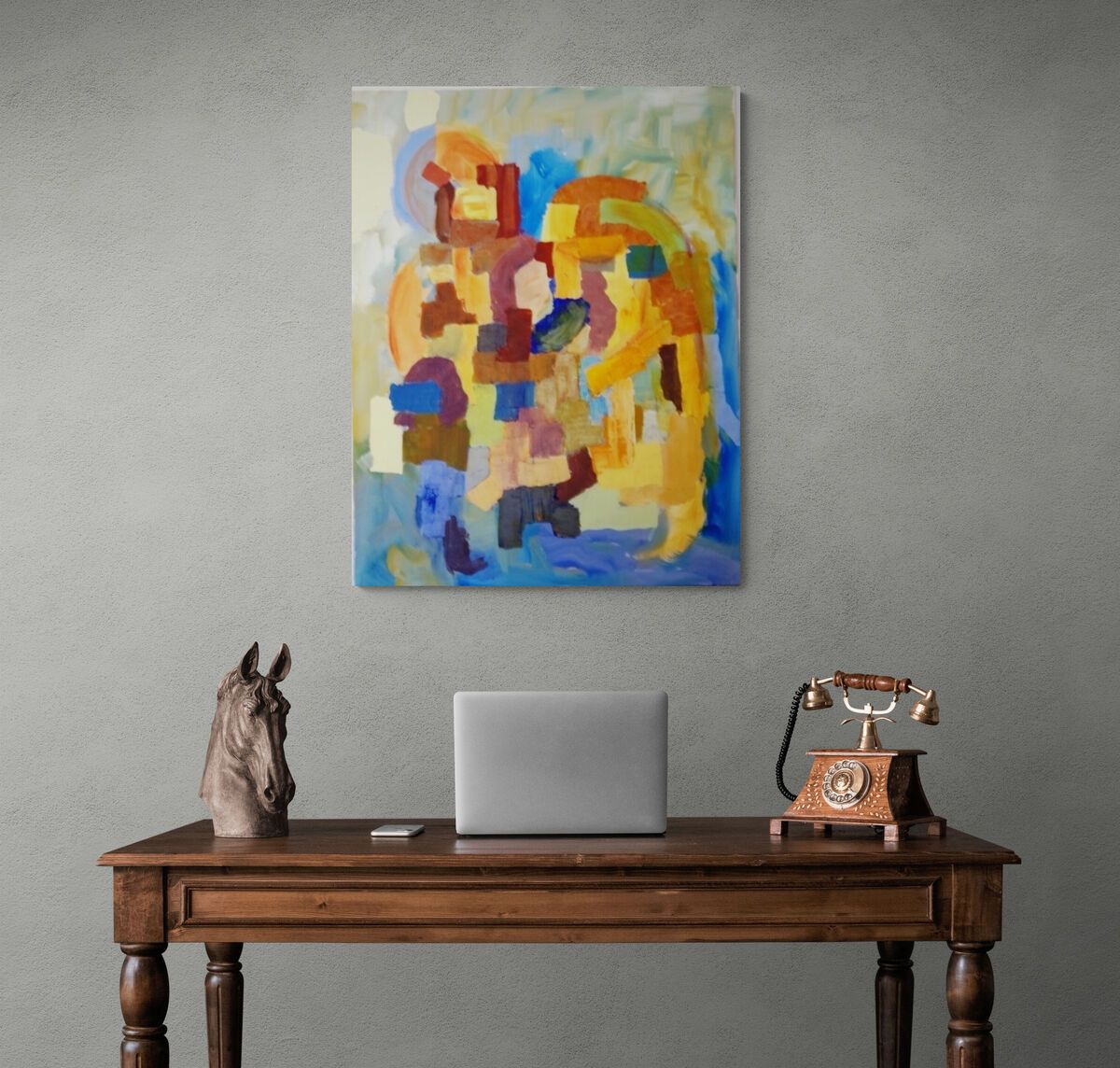 - cy1 - Acrylique sur toile 90 x 70 - 03 17 La rencontre chaleureuse de ces cinq personnages et le petit enfant, traitée de manière abstraite et aux couleurs chaudes pour traduire le plaisir de la rencontre