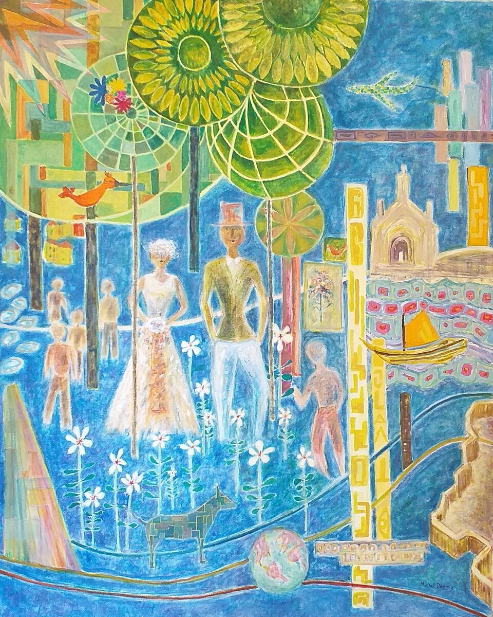 - cy1 - Acrylique sur toile 90 x 70 - 03 17 La rencontre chaleureuse de ces cinq personnages et le petit enfant, traitée de manière abstraite et aux couleurs chaudes pour traduire le plaisir de la rencontre
